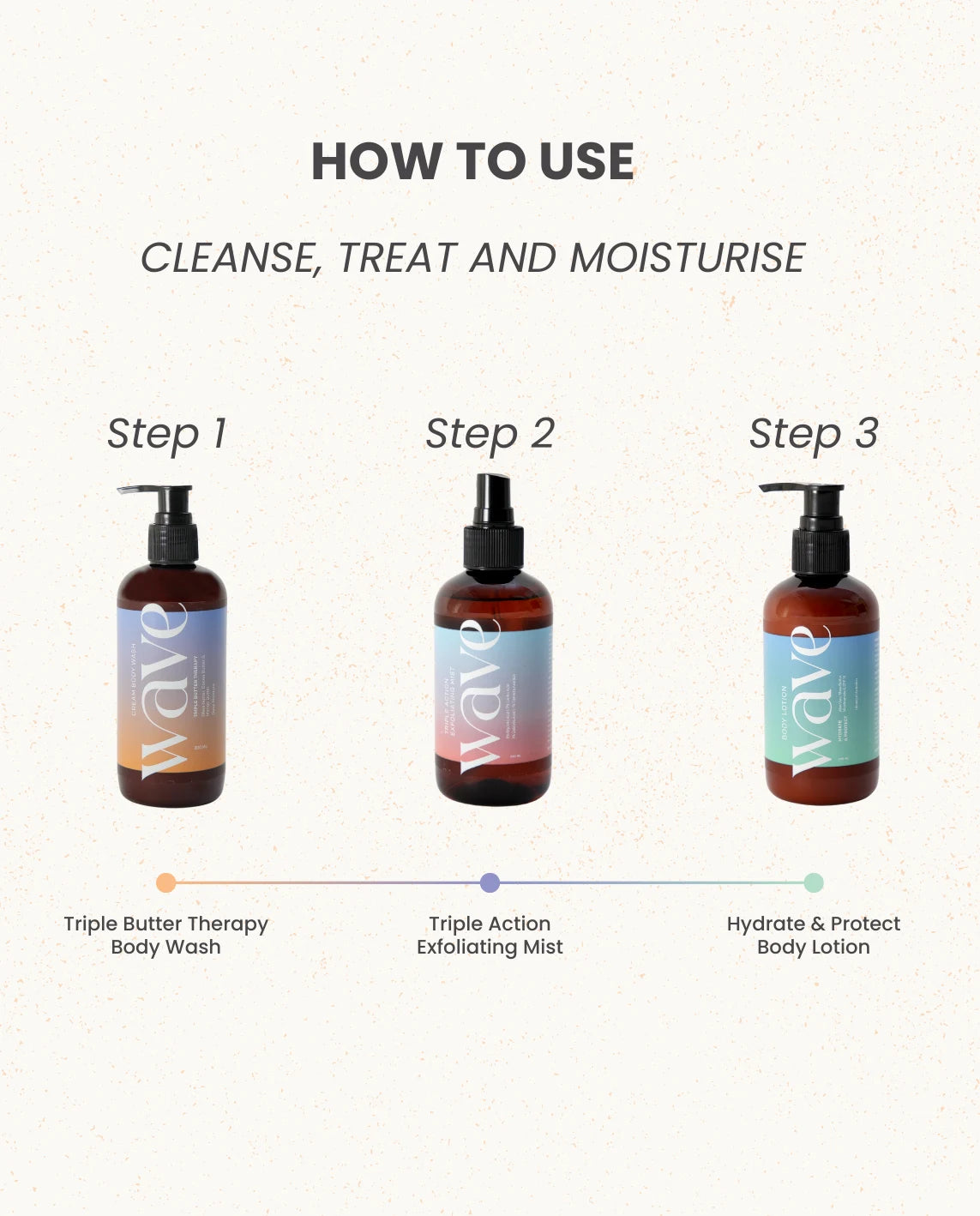 Find your flow wherever you go. The Complete Hydration Set brings Wave’s deeply nourishing trio in travel-ready sizes - your full-body ritual for soft, smooth, and replenished skin. Begin with a rich butter-infused body wash that cleanses without stripping, follow with a gentle exfoliating mist to smooth rough texture, and finish with our lightweight, aloe-infused lotion for long-lasting hydration.
