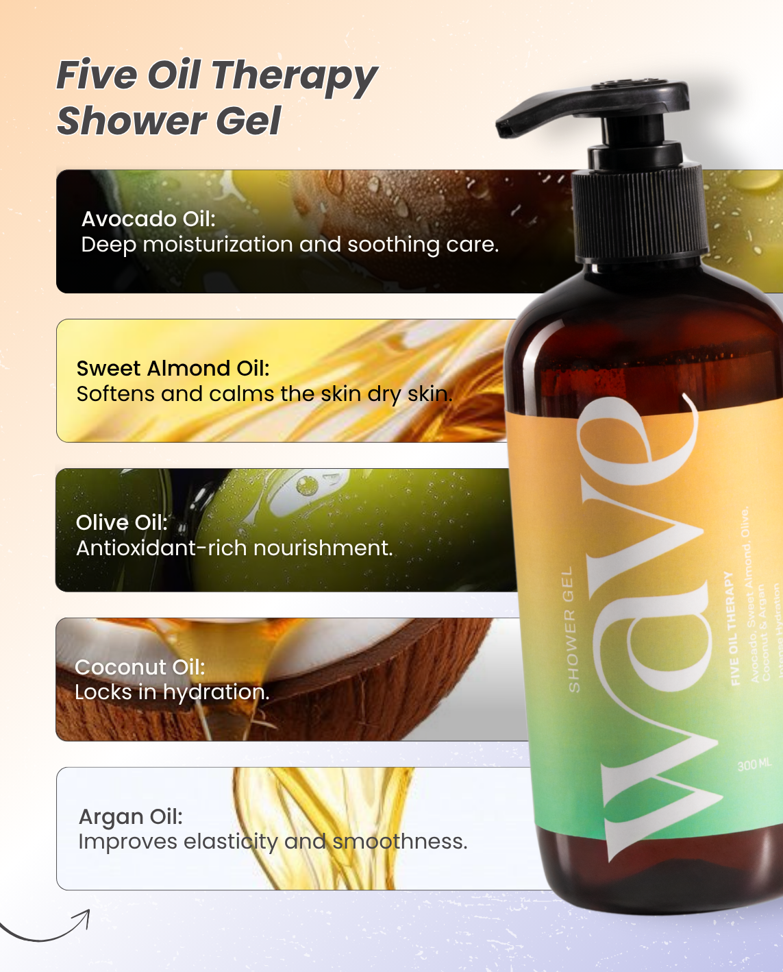 Five Oil Therapy Shower Gel (300ml) – A luxurious cleanser enriched with avocado, sweet almond, olive, coconut, and argan oils to nourish and soften.